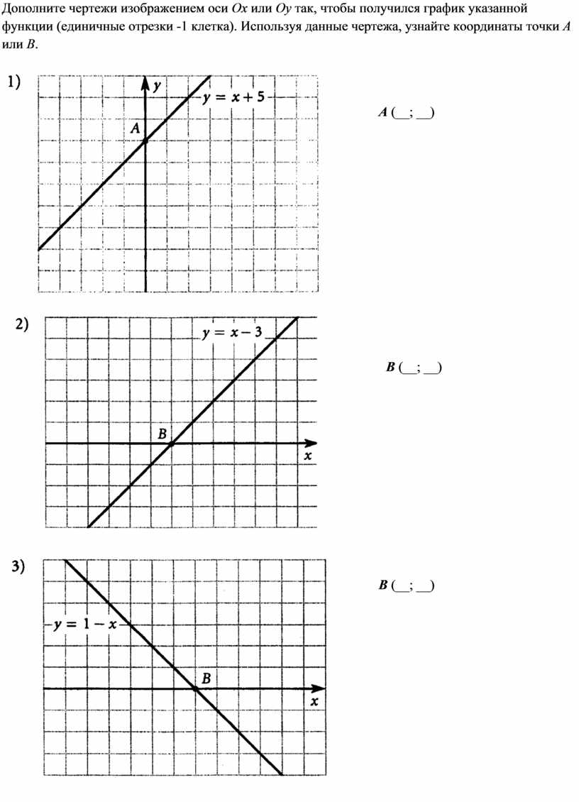 Дополните чертежи изображением оси Ох или Оу так, чтобы получился график указанной функции (единичные отрезки -1 клетка). Используя данные чертежа, узнайте координаты точки А или В.