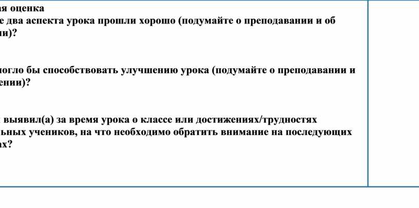 Общая оценка Какие два аспекта урока прошли хорошо (подумайте о преподавании и об учении)? 1: 2: Что могло бы способствовать улучшению урока (подумайте о преподавании и об учении)? 1: 2: Что я выявил(а) за время урока о классе или достижениях/трудностях отдельных учеников, на что необходимо обратить внимание на последующих уроках?
