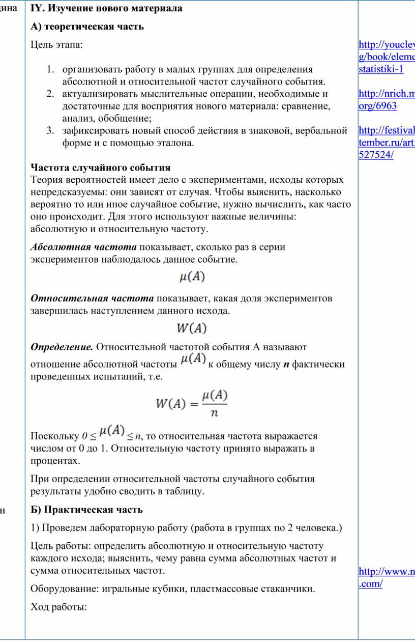 Сводная таблица подготовлена в формате Excel, что позволяет быстро подвести итоги и вывести результат на экран. 4) Проанализируйте, чему равна сумма абсолютных частот и сумма относительных частот, в случае большого числа экспериментов. 5) Сделайте вывод. 6) Как вы считаете, справедливо ли использование кубика в настольных играх? V. Включение в систему знаний и повторение. Цель этапа: