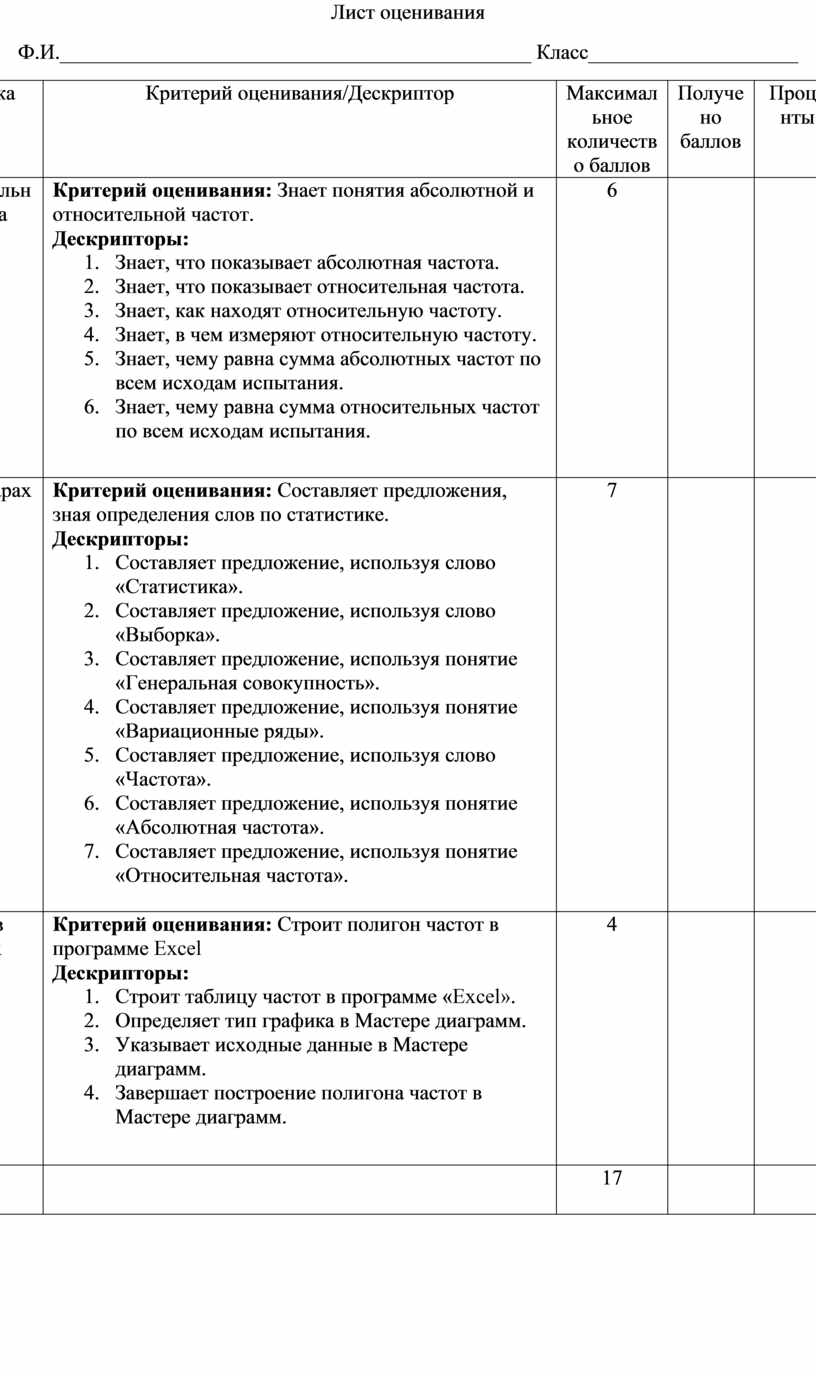 Критерий оценивания: Знает понятия абсолютной и относительной частот. Дескрипторы: 1. Знает, что показывает абсолютная частота. 2. Знает, что показывает относительная частота. 3. Знает, как находят относительную частоту. 4. Знает, в чем измеряют относительную частоту. 5. Знает, чему равна сумма абсолютных частот по всем исходам испытания. 6. Знает, чему равна сумма относительных частот по всем исходам испытания.