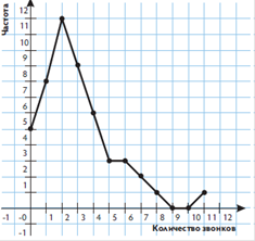 (Учитель обращает внимание учащихся на то, что при построении полигона частот масштабы в осях Оу и Ох могут быть не равными, так как на этих осях представлены неравнозначные данные. Так на оси Ох показано количество звонков , а на Оу – их абсолютная частота).