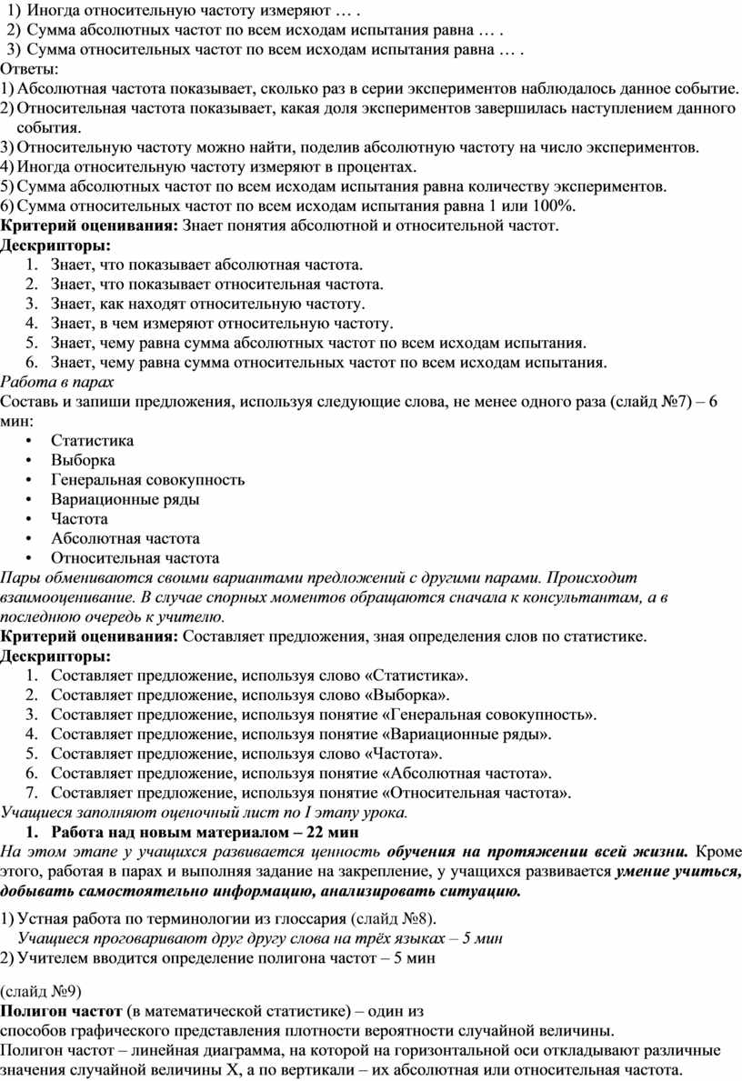 На этом этапе у учащихся развиваются ценности: обучение на протяжении всей жизни, а также отвечать за качество своей работы и своей пары, умение организовывать свое время, учитывать мнение своего одноклассника. 1) Индивидуальная работа – 7 мин (слайды №4-6). (Учащийся проверяет себя по образцам и оценивает). 1) Абсолютная частота показывает, сколько раз … . 2) Относительная частота показывает, … . 3) Относительную частоту можно найти, … . 4) Иногда относительную частоту измеряют … . 5) Сумма абсолютных частот по всем исходам испытания равна … . 6) Сумма относительных частот по всем исходам испытания равна … . Ответы: 1) Абсолютная частота показывает, сколько раз в серии экспериментов наблюдалось данное событие. 2) Относительная частота показывает, какая доля экспериментов завершилась наступлением данного события. 3) Относительную частоту можно найти, поделив абсолютную частоту на число экспериментов. 4) Иногда относительную частоту измеряют в процентах. 5) Сумма абсолютных частот по всем исходам испытания равна количеству экспериментов. 6) Сумма относительных частот по всем исходам испытания равна 1 или 100%. Критерий оценивания: Знает понятия абсолютной и относительной частот. Дескрипторы: 1. Знает, что показывает абсолютная частота. 2. Знает, что показывает относительная частота. 3. Знает, как находят относительную частоту. 4. Знает, в чем измеряют относительную частоту. 5. Знает, чему равна сумма абсолютных частот по всем исходам испытания. 6. Знает, чему равна сумма относительных частот по всем исходам испытания. Работа в парах Составь и запиши предложения, используя следующие слова, не менее одного раза (слайд №7) – 6 мин: • Статистика • Выборка • Генеральная совокупность • Вариационные ряды • Частота • Абсолютная частота • Относительная частота Пары обмениваются своими вариантами предложений с другими парами. Происходит взаимооценивание. В случае спорных моментов обращаются сначала к консультантам, а в последнюю очередь к учителю. Критерий оценивания: Составляет предложения, зная определения слов по статистике. Дескрипторы: 1. Составляет предложение, используя слово «Статистика». 2. Составляет предложение, используя слово «Выборка». 3. Составляет предложение, используя понятие «Генеральная совокупность». 4. Составляет предложение, используя понятие «Вариационные ряды». 5. Составляет предложение, используя слово «Частота». 6. Составляет предложение, используя понятие «Абсолютная частота». 7. Составляет предложение, используя понятие «Относительная частота». Учащиеся заполняют оценочный лист по I этапу урока.
