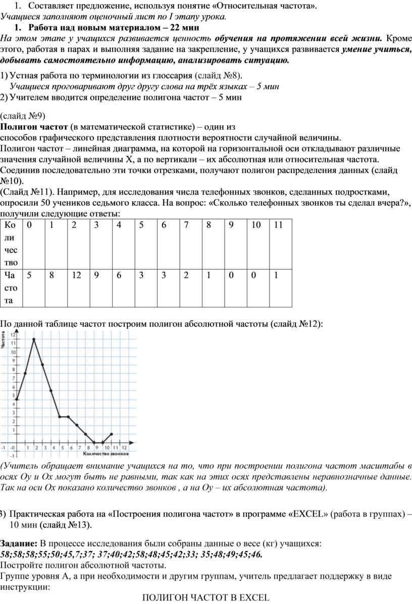 На этом этапе у учащихся развивается ценность обучения на протяжении всей жизни. Кроме этого, работая в парах и выполняя задание на закрепление, у учащихся развивается умение учиться, добывать самостоятельно информацию, анализировать ситуацию. 1) Устная работа по терминологии из глоссария (слайд №8). Учащиеся проговаривают друг другу слова на трёх языках – 5 мин 2) Учителем вводится определение полигона частот – 5 мин (слайд №9) Полигон частот (в математической статистике) – один из способов графического представления плотности вероятности случайной величины. Полигон частот – линейная диаграмма, на которой на горизонтальной оси откладывают различные значения случайной величины Х, а по вертикали – их абсолютная или относительная частота. Соединив последовательно эти точки отрезками, получают полигон распределения данных (слайд №10). (Слайд №11). Например, для исследования числа телефонных звонков, сделанных подростками, опросили 50 учеников седьмого класса. На вопрос: «Сколько телефонных звонков ты сделал вчера?», получили следующие ответы:
