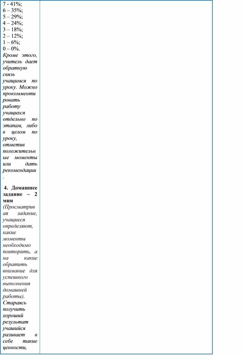 После каждого этапа урока происходит оценивание работы (самооценивание, взаимооценивание или оценивание учителем). В конце урока учащиеся подсчитывают средний процент и результаты отдают учителю. |