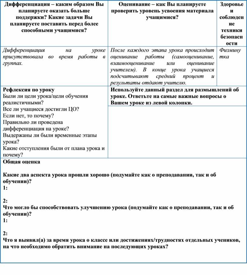 Рефлексия по уроку Были ли цели урока/цели обучения реалистичными? Все ли учащиеся достигли ЦО? Если нет, то почему? Правильно ли проведена дифференциация на уроке? Выдержаны ли были временные этапы урока? Какие отступления были от плана урока и почему? |