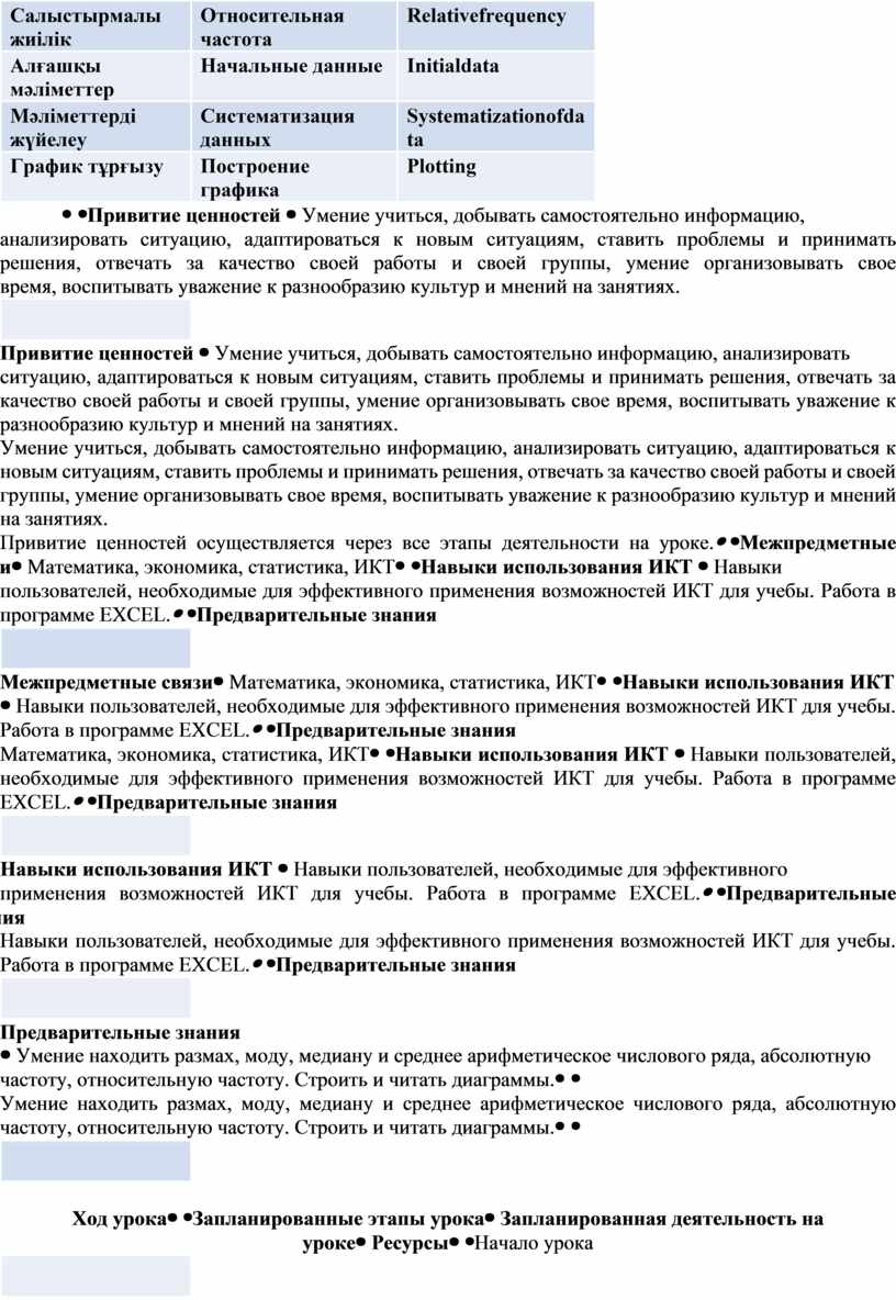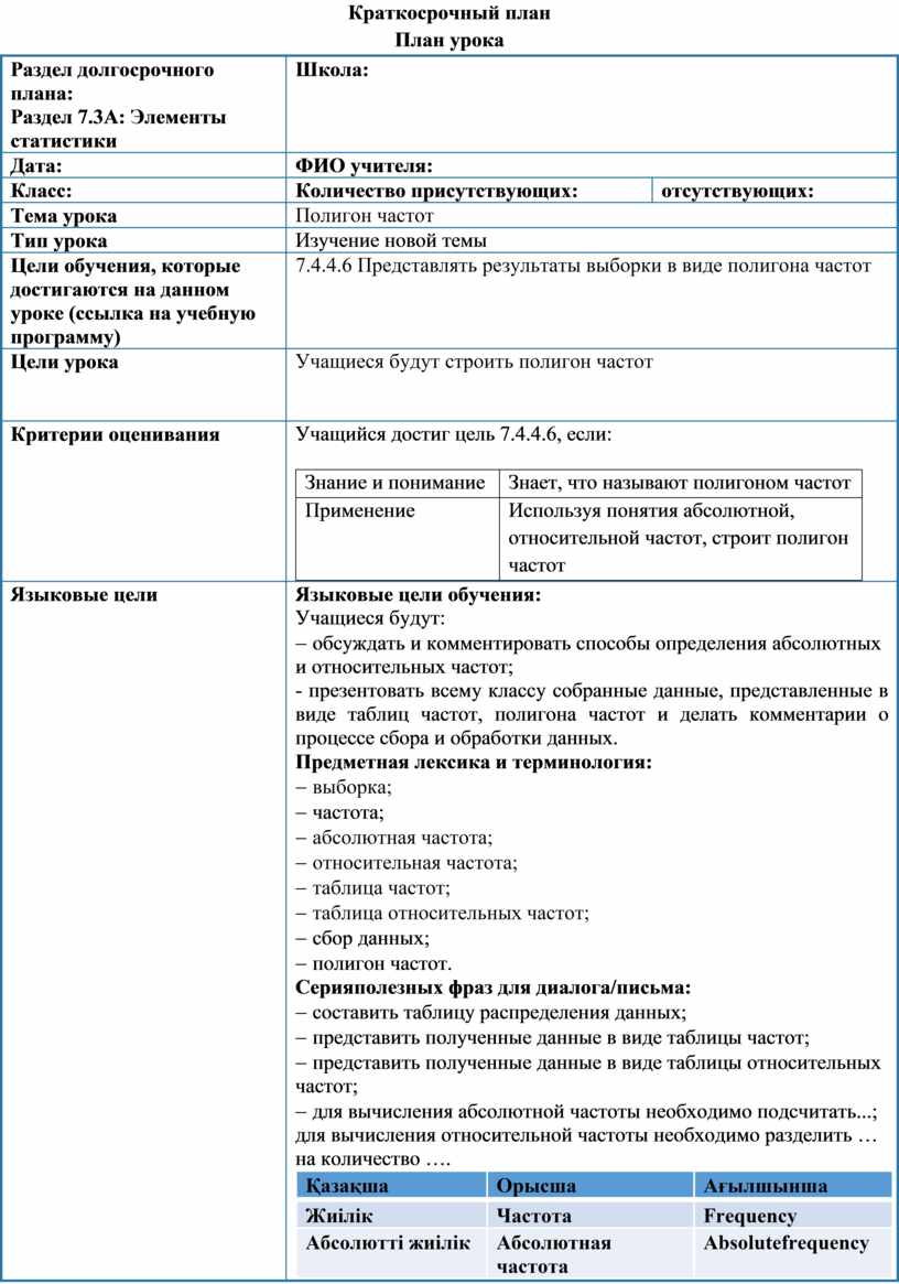 Языковые цели обучения: Учащиеся будут: - обсуждать и комментировать способы определения абсолютных и относительных частот; - презентовать всему классу собранные данные, представленные в виде таблиц частот, полигона частот и делать комментарии о процессе сбора и обработки данных. Предметная лексика и терминология: - выборка; - частота; - абсолютная частота; - относительная частота; - таблица частот; - таблица относительных частот; - сбор данных; - полигон частот. Серияполезных фраз для диалога/письма: - составить таблицу распределения данных; - представить полученные данные в виде таблицы частот; - представить полученные данные в виде таблицы относительных частот; - для вычисления абсолютной частоты необходимо подсчитать...; для вычисления относительной частоты необходимо разделить … на количество ….