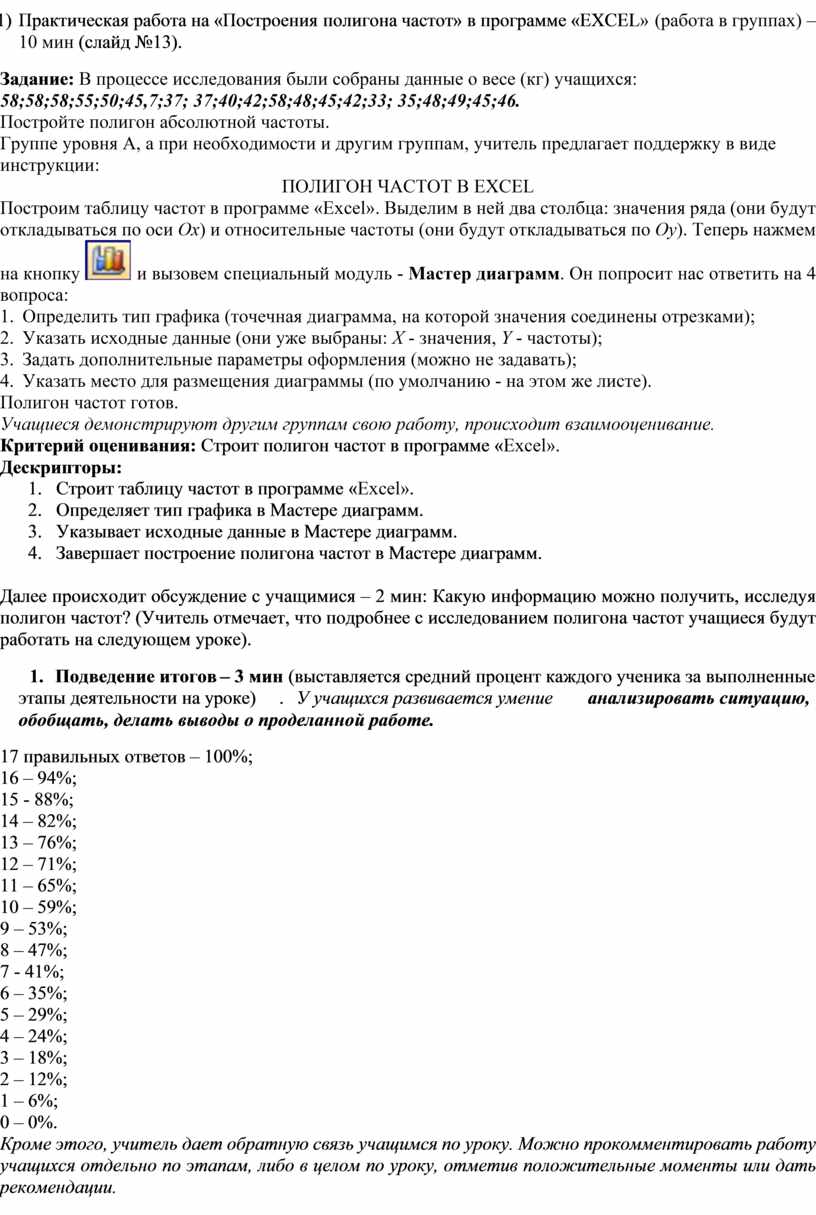 на кнопку 1. Определить тип графика (точечная диаграмма, на которой значения соединены отрезками); 2. Указать исходные данные (они уже выбраны: X - значения, Y - частоты); 3. Задать дополнительные параметры оформления (можно не задавать); 4. Указать место для размещения диаграммы (по умолчанию - на этом же листе). Полигон частот готов. Учащиеся демонстрируют другим группам свою работу, происходит взаимооценивание. Критерий оценивания: Строит полигон частот в программе «Excel». Дескрипторы: 1. Строит таблицу частот в программе «Excel». 2. Определяет тип графика в Мастере диаграмм. 3. Указывает исходные данные в Мастере диаграмм. 4. Завершает построение полигона частот в Мастере диаграмм.