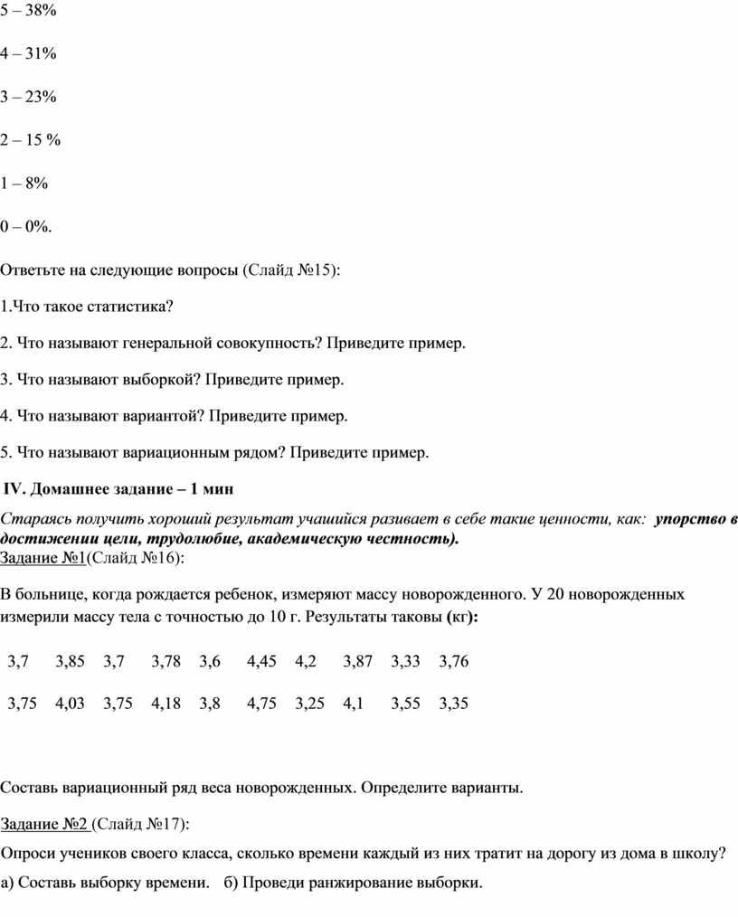 III. Подведение итогов – 4 мин (выставляется средний процент каждого ученика за выполненные этапы деятельности на уроке). У учащихся развивается умение анализировать ситуацию, обобщать, делать выводы о проделанной работе. 13 правильных ответов – 100% 12 – 92% 11 – 85% 10 – 83% 9 – 69% 8 – 62% 7- 54% 6 – 46% 5 – 38% 4 – 31% 3 – 23% 2 – 15 % 1 – 8% 0 – 0%. Ответьте на следующие вопросы (Слайд №15): 1.Что такое статистика? 2. Что называют генеральной совокупность? Приведите пример. 3. Что называют выборкой? Приведите пример. 4. Что называют вариантой? Приведите пример. 5. Что называют вариационным рядом? Приведите пример. IV. Домашнее задание – 1 мин Стараясь получить хороший результат учашийся разивает в себе такие ценности, как: упорство в достижении цели, трудолюбие, академическую честность). Задание №1(Слайд №16): В больнице, когда рождается ребенок, измеряют массу новорожденного. У 20 новорожденных измерили массу тела с точностью до 10 г. Результаты таковы (кг):