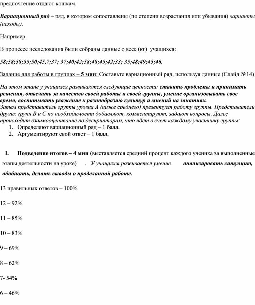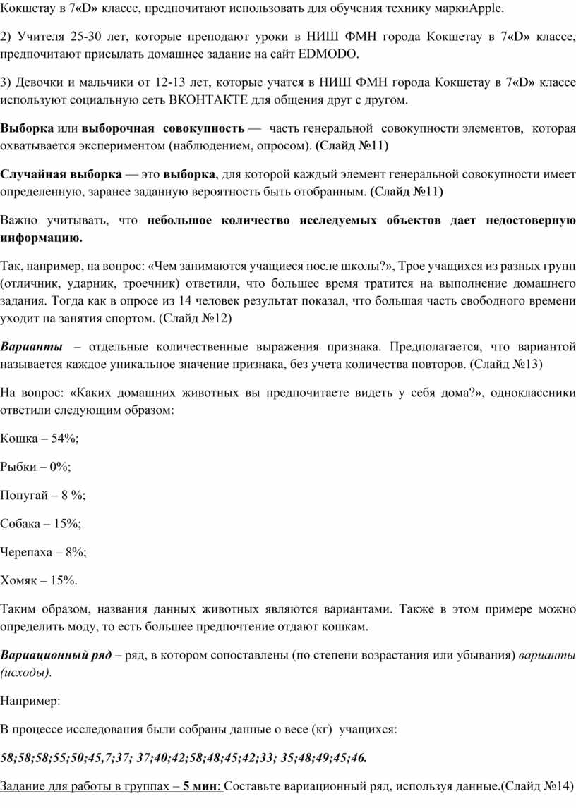 1) Девочки и мальчики 12-13 лет, которые учатся в НИШ ФМН города Кокшетау в 7«D» классе, предпочитают использовать для обучения технику маркиApple. 2) Учителя 25-30 лет, которые преподают уроки в НИШ ФМН города Кокшетау в 7«D» классе, предпочитают присылать домашнее задание на сайт EDMODО. 3) Девочки и мальчики от 12-13 лет, которые учатся в НИШ ФМН города Кокшетау в 7«D» классе используют социальную сеть ВКОНТАКТЕ для общения друг с другом. Выборка или выборочная совокупность — часть генеральной совокупности элементов, которая охватывается экспериментом (наблюдением, опросом). (Слайд №11) Случайная выборка — это выборка, для которой каждый элемент генеральной совокупности имеет определенную, заранее заданную вероятность быть отобранным. (Слайд №11) Важно учитывать, что небольшое количество исследуемых объектов дает недостоверную информацию. Так, например, на вопрос: «Чем занимаются учащиеся после школы?», Трое учащихся из разных групп (отличник, ударник, троечник) ответили, что большее время тратится на выполнение домашнего задания. Тогда как в опросе из 14 человек результат показал, что большая часть свободного времени уходит на занятия спортом. (Слайд №12) Варианты – отдельные количественные выражения признака. Предполагается, что вариантой называется каждое уникальное значение признака, без учета количества повторов. (Слайд №13) На вопрос: «Каких домашних животных вы предпочитаете видеть у себя дома?», одноклассники ответили следующим образом: Кошка – 54%; Рыбки – 0%; Попугай – 8 %; Собака – 15%; Черепаха – 8%; Хомяк – 15%. Таким образом, названия данных животных являются вариантами. Также в этом примере можно определить моду, то есть большее предпочтение отдают кошкам. Вариационный ряд – ряд, в котором сопоставлены (по степени возрастания или убывания) варианты (исходы). Например: В процессе исследования были собраны данные о весе (кг) учащихся: 58;58;58;55;50;45,7;37; 37;40;42;58;48;45;42;33; 35;48;49;45;46. Задание для работы в группах – 5 мин: Составьте вариационный ряд, используя данные.(Слайд №14) На этом этапе у учащихся развиваются следующие ценности: ставить проблемы и принимать решения, отвечать за качество своей работы и своей группы, умение организовывать свое время, воспитывать уважение к разнообразию культур и мнений на занятиях. Затем представитель группы уровня А (ниже среднего) презентует работу группы. Представители других групп В и С по необходимости добавляют, комментируют, задают вопросы. Далее происходит взаимооценивание по дескрипторам, что идет в счет каждому участнику группы: 1. Определяют вариационный ряд – 1 балл. 2. Аргументируют свой ответ – 1 балл.