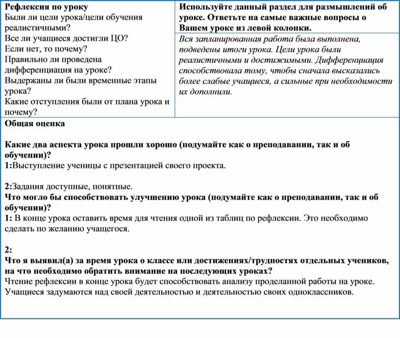 Используйте данный раздел для размышлений об уроке. Ответьте на самые важные вопросы о Вашем уроке из левой колонки. |