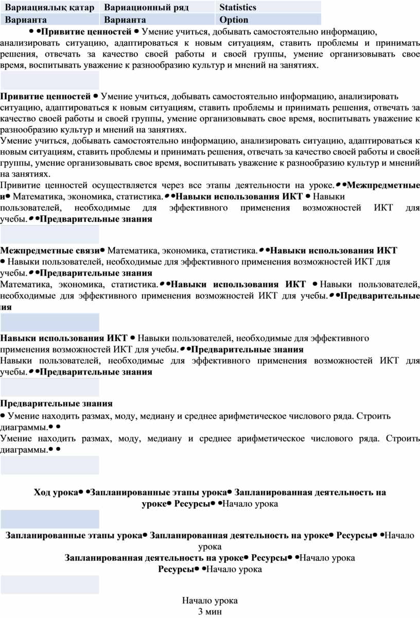Языковые цели обучения: Учащиеся будут: -презентовать всему классу собранные данные, представленные в виде статистических характеристик, и делать комментарии о процессе сбора и обработки данных Предметная лексика и терминология: - упорядоченный ряд; - элемент ряда; - генеральная совокупность; - варианта; - вариационный ряд; - статистический ряд; - выборка Серия полезных фраз для диалога/письма: Глоссарий