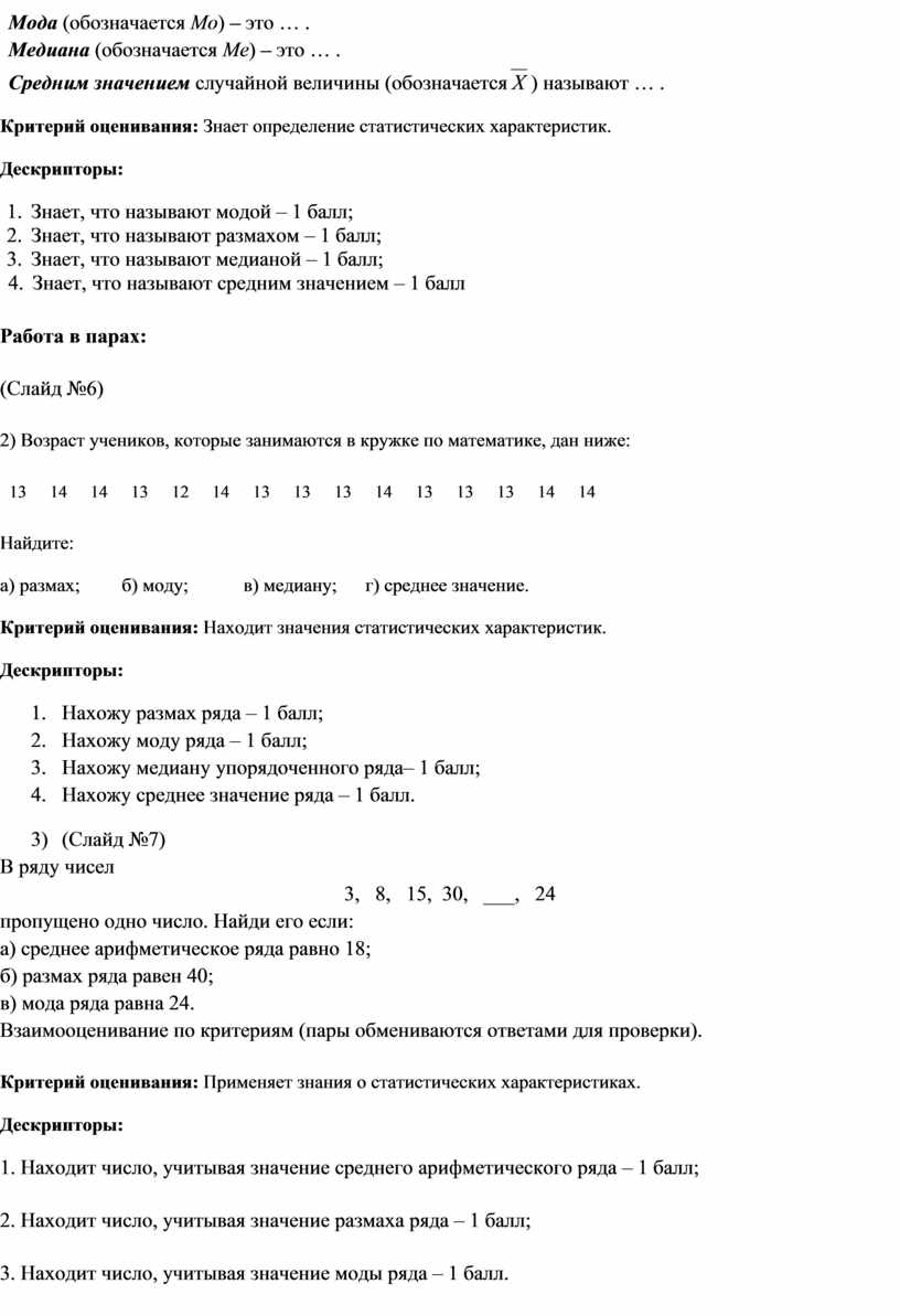 значением случайной величины (обозначается Критерий оценивания: Знает определение статистических характеристик. Дескрипторы: 1. Знает, что называют модой – 1 балл; 2. Знает, что называют размахом – 1 балл; 3. Знает, что называют медианой – 1 балл; 4. Знает, что называют средним значением – 1 балл Работа в парах: (Слайд №6) 2) Возраст учеников, которые занимаются в кружке по математике, дан ниже: