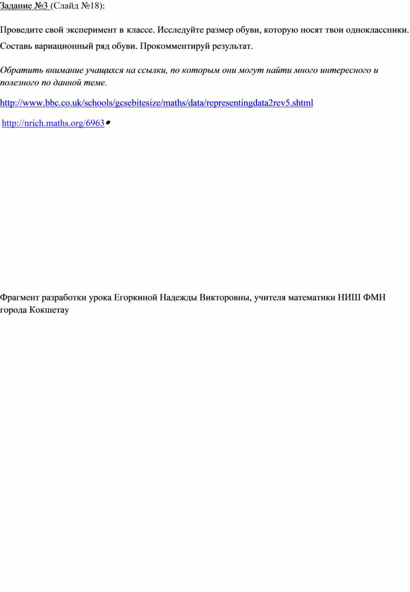 Составь вариационный ряд веса новорожденных. Определите варианты. Задание №2 (Слайд №17): Опроси учеников своего класса, сколько времени каждый из них тратит на дорогу из дома в школу? а) Составь выборку времени. б) Проведи ранжирование выборки. Задание №3 (Слайд №18): Проведите свой эксперимент в классе. Исследуйте размер обуви, которую носят твои одноклассники. Составь вариационный ряд обуви. Прокомментируй результат. Обратить внимание учащихся на ссылки, по которым они могут найти много интересного и полезного по данной теме. http://www.bbc.co.uk/schools/gcsebitesize/maths/data/representingdata2rev5.shtml http://nrich.maths.org/6963 |