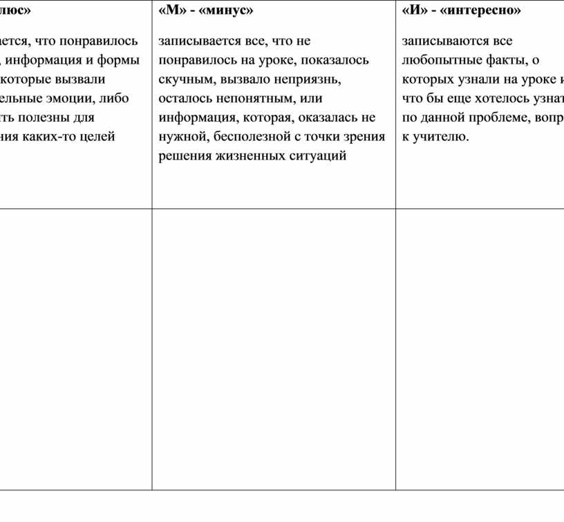 «П» - «плюс» записывается, что понравилось на уроке, информация и формы работы, которые вызвали положительные эмоции, либо могут быть полезны для достижения каких-то целей |
