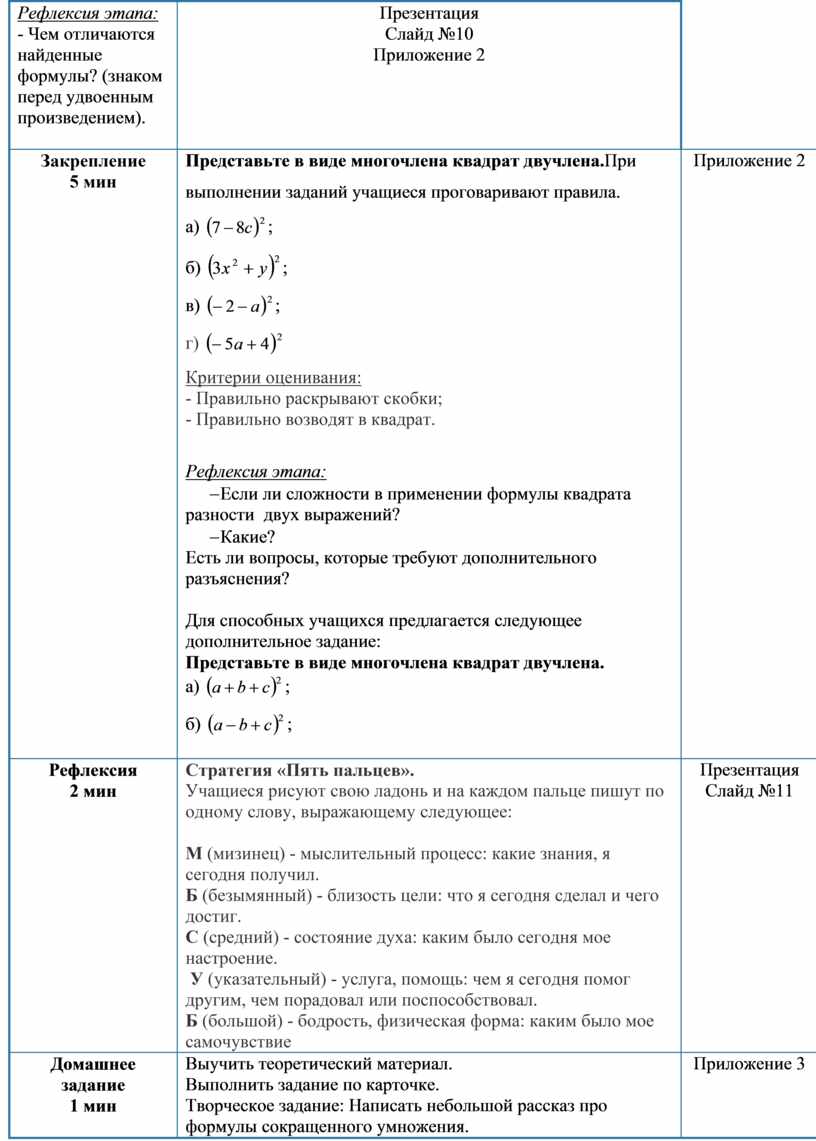 Просмотр видеоматериала по http://bilimland.kz/ru/home#lesson=10023 (вместо данного видео можно показать либо любое видео, демонстрирующее примеры применения изученных формул сокращенного умножения, либо можно самостоятельно показать несколько примеров) Рефлексия этапа: - Есть ли сложности в применении формулы квадрата суммы двух выражений? - Какие? - Есть ли вопросы, которые требуют дополнительного разъяснения? |