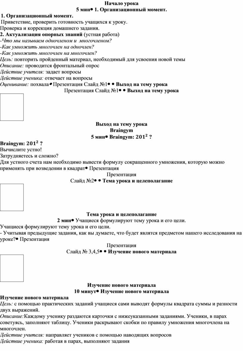 1. Организационный момент. Приветствие, проверить готовность учащихся к уроку. Проверка и коррекция домашнего задания. 2. Актуализация опорных знаний (устная работа) -Что мы называем одночленом и многочленом? -Как умножить многочлен на одночлен? -Как умножить многочлен на многочлен? Цель: повторить пройденный материал, необходимый для усвоения новой темы Описание: проводится фронтальный опрос Действие учителя: задает вопросы Действие ученика: отвечает на вопросы Оценивание: похвала |