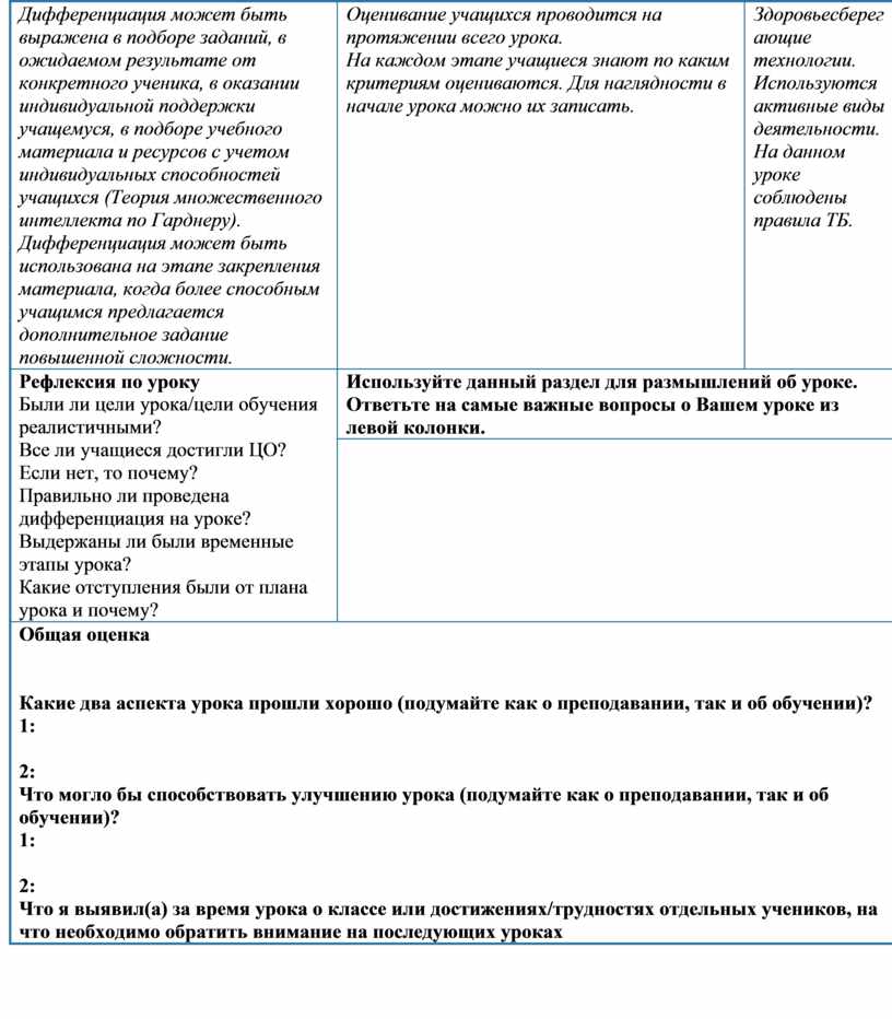 Рефлексия по уроку Были ли цели урока/цели обучения реалистичными? Все ли учащиеся достигли ЦО? Если нет, то почему? Правильно ли проведена дифференциация на уроке? Выдержаны ли были временные этапы урока? Какие отступления были от плана урока и почему? |