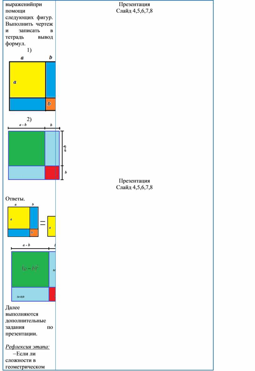 Рефлексия этапа: - Если ли сложности в геометрическом выводе формулы квадрата суммы и разности двух выражений? - Какие? - Есть ли вопросы, которые требуют дополнительного разъяснения?