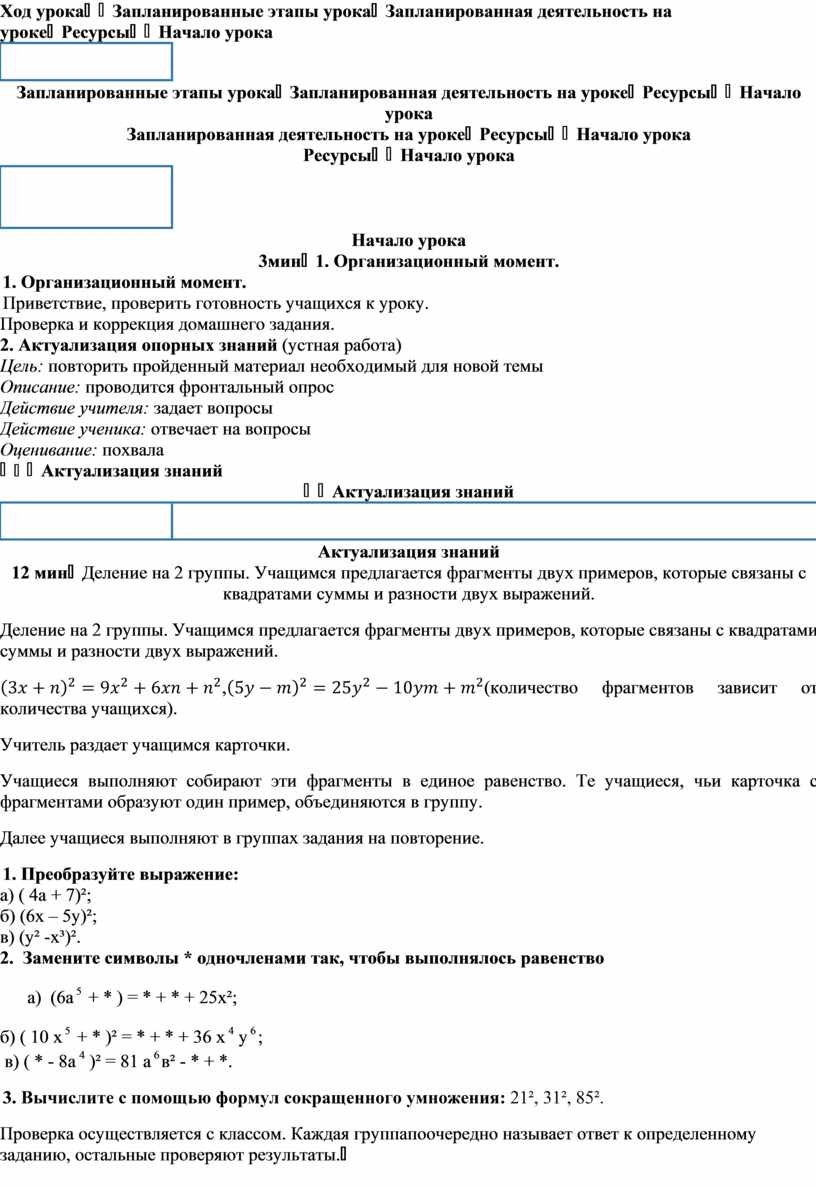 Деление на 2 группы. Учащимся предлагается фрагменты двух примеров, которые связаны с квадратами суммы и разности двух выражений.