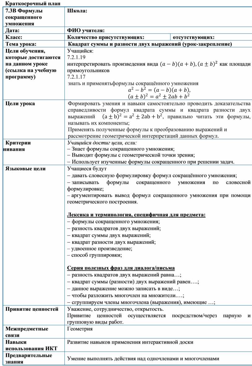 Лексика и терминология, специфичная для предмета: - формулы сокращенного умножения; - разность квадратов двух выражений; - квадрат суммы двух выражений; - квадрат разности двух выражений; - удвоенное произведение; - способ группировки;