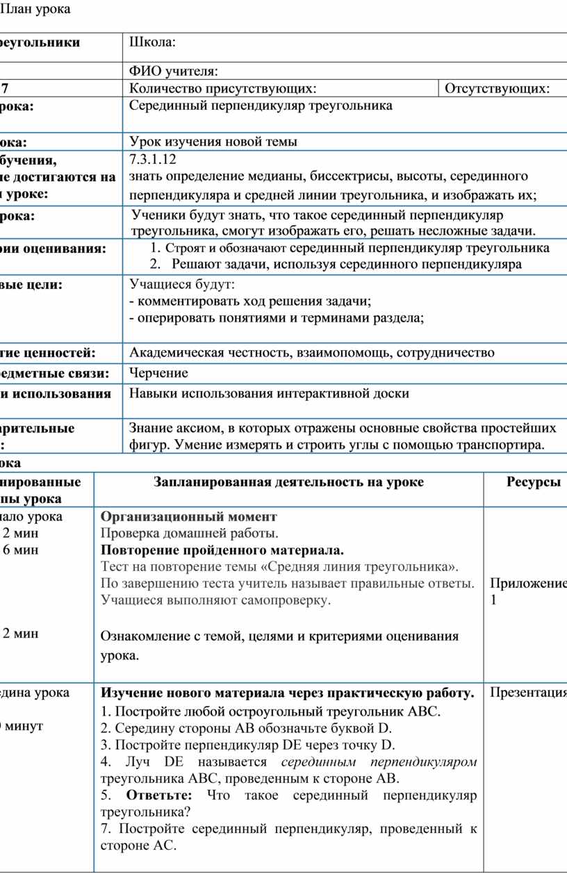 Ученики будут знать, что такое серединный перпендикуляр треугольника, смогут изображать его, решать несложные задачи. |