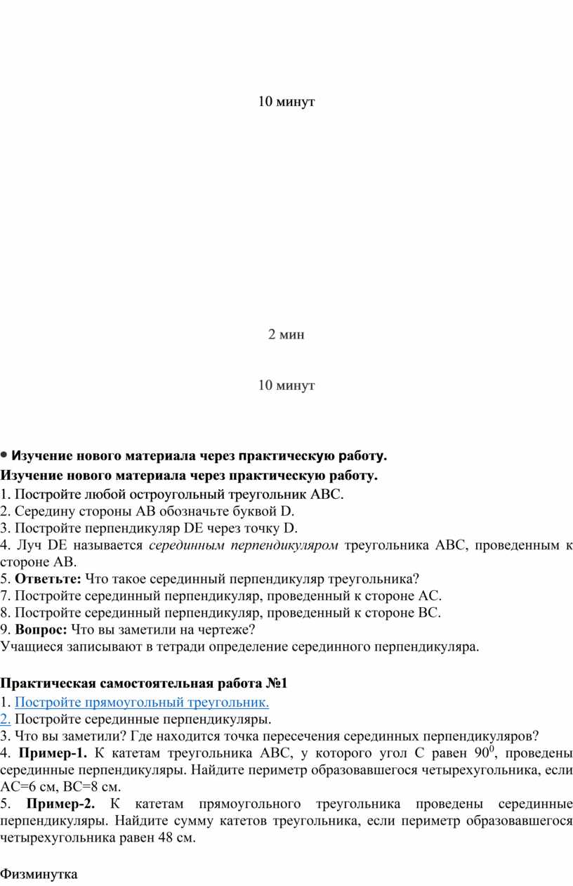 Изучение нового материала через практическую работу. 1. Постройте любой остроугольный треугольник АВС. 2. Середину стороны АВ обозначьте буквой D. 3. Постройте перпендикуляр DЕ через точку D. 4. Луч DE называется серединным перпендикуляром треугольника АВС, проведенным к стороне АВ. 5. Ответьте: Что такое серединный перпендикуляр треугольника? 7. Постройте серединный перпендикуляр, проведенный к стороне АС. 8. Постройте серединный перпендикуляр, проведенный к стороне ВС. 9. Вопрос: Что вы заметили на чертеже? Учащиеся записывают в тетради определение серединного перпендикуляра.
