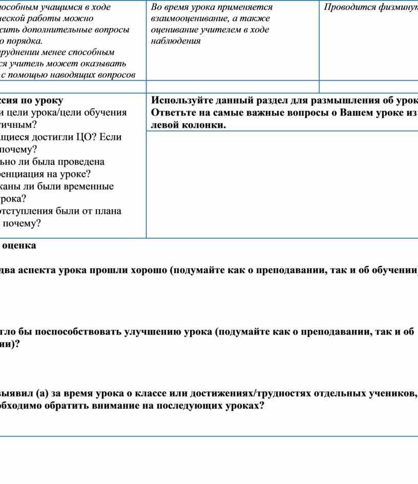 Используйте данный раздел для размышления об уроке. Ответьте на самые важные вопросы о Вашем уроке из левой колонки. |