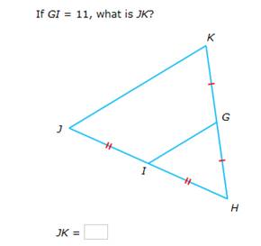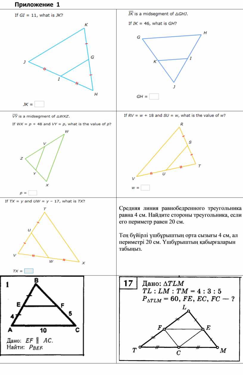 Тең бүйірлі үшбұрыштың орта сызығы 4 см, ал периметрі 20 см. Үшбұрыштың қабырғаларын табыңыз. |