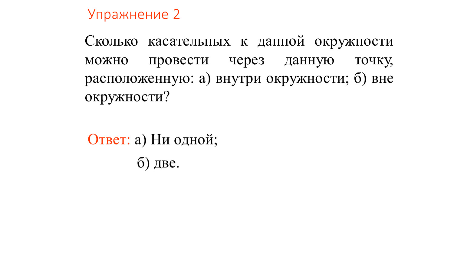 Сколько касательных к данной окружности можно провести через данную точку, расположенную: а) внутри окружности; б) вне окружности?