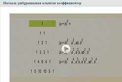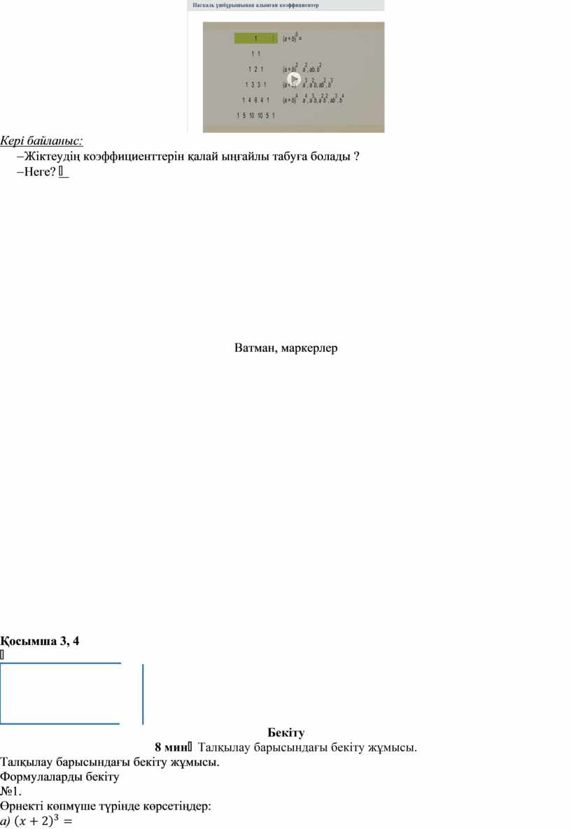 Өздігінен «айырманың кубы» формуласын дәлелдеңдер және ауызша қорытындылаңдар. -Екі өрнектің қосындысының кубы бірінші өрнектің кубына, плюс бірінші өрнектің квадраты мен екінші өрнектің үш еселенген көбейтіндісіне, плюс бірінші өрнек пен екінші өрнектің квадраттарының үш еселенген көбейтіндісіне, плюс екінші өрнектің кубына тең. -Екі өрнектің айырмасының кубы бірінші өрнектің кубына, минус бірінші өрнектің квадраты мен екінші өрнектің үш еселенген көбейтіндісіне, плюс бірінші өрнек пен екінші өрнектің квадратының үш еселенген көбейтіндісіне, минус екінші өрнектің кубына тең. Топтық жұмыстың қорғауы. Тақырыпты тереңдету Оқушылар Паскаль үшбұрышымен танысады. Оны зерттегесін, кубтың қосындысы мен айырмасының коэффициенттеріне шығады. Бейнебаян көреді (ссылкны қараңыз).