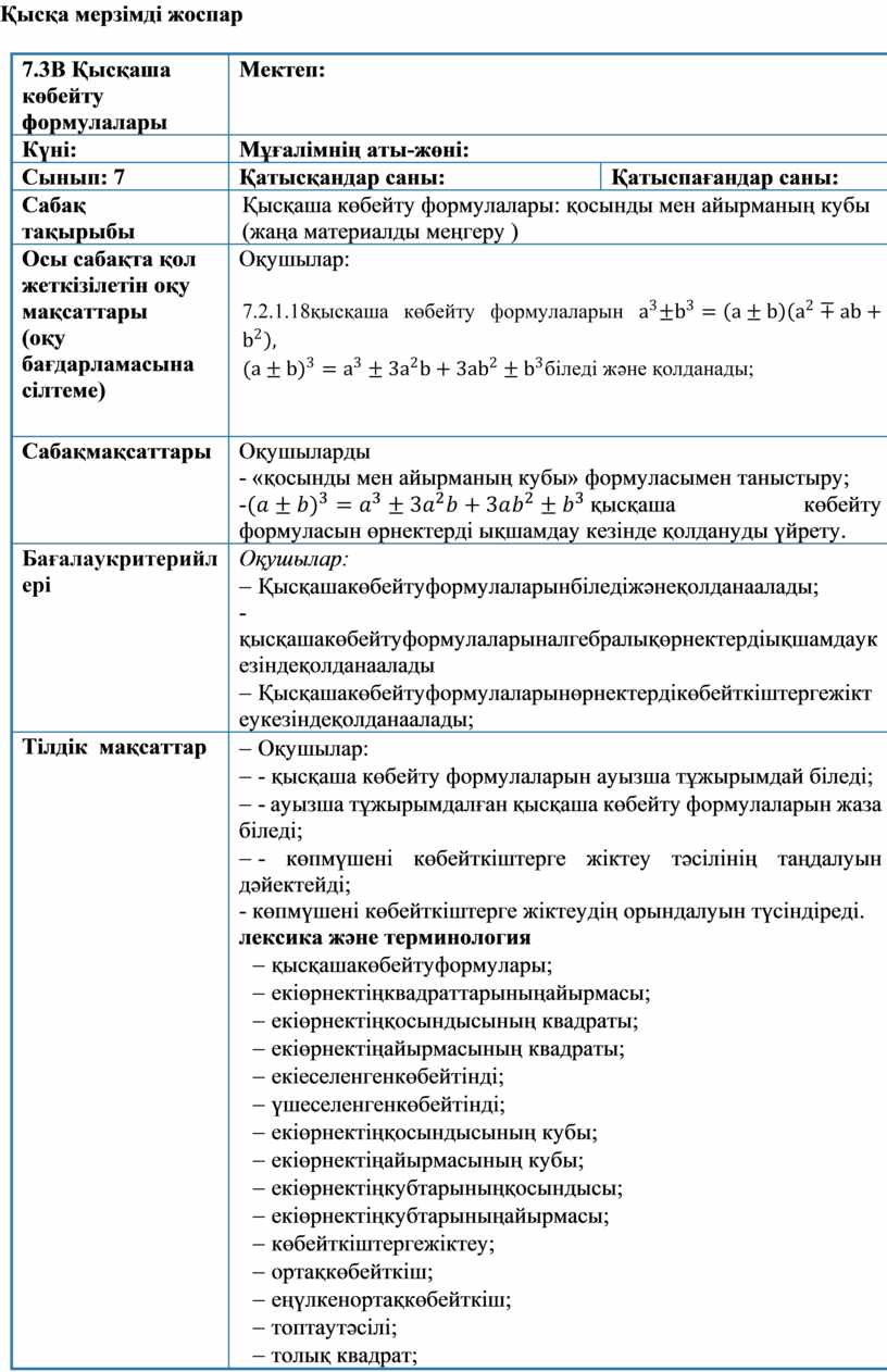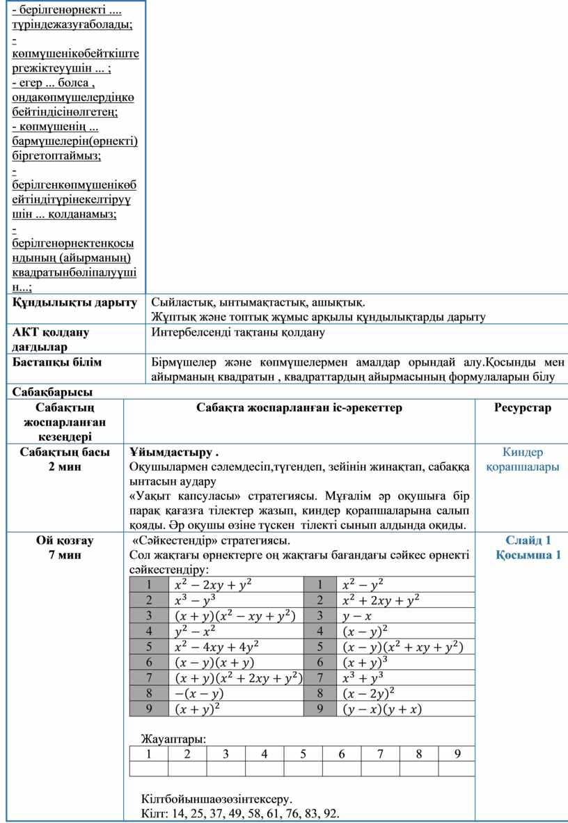 - Оқушылар: - - қысқаша көбейту формулаларын ауызша тұжырымдай біледі; - - ауызша тұжырымдалған қысқаша көбейту формулаларын жаза біледі; - - көпмүшені көбейткіштерге жіктеу тәсілінің таңдалуын дәйектейді; - көпмүшені көбейткіштерге жіктеудің орындалуын түсіндіреді. лексика және терминология - қысқашакөбейтуформулары; - екіөрнектіңквадраттарыныңайырмасы; - екіөрнектіңқосындысының квадраты; - екіөрнектіңайырмасының квадраты; - екіеселенгенкөбейтінді; - үшеселенгенкөбейтінді; - екіөрнектіңқосындысының кубы; - екіөрнектіңайырмасының кубы; - екіөрнектіңкубтарыныңқосындысы; - екіөрнектіңкубтарыныңайырмасы; - көбейткіштергежіктеу; - ортақкөбейткіш; - еңүлкенортақкөбейткіш; - топтаутәсілі; - толық квадрат; - толымсыз квадрат. Диалогқа/жазылымға қажетті тіркестер - екіөрнектіңквадраттарыныңайырмасы .... тең; - екіөрнектіңқосындысының (айырмасының) квадраты .... тең; - екіөрнектіңқосындысының (айырмасының) кубы ... тең; - екіөрнектіңкубтарыныңқосындысы ( айырмасы) ...... ; - ортақкөбейткіштіжақшасыртынашығаруүшін...; - коэфициенттердіңеңүлкенортақбөлгіші; - берілгенөрнекті .... түріндежазуғаболады; - көпмүшенікөбейткіштергежіктеуүшін ... ; - егер ... болса , ондакөпмүшелердіңкөбейтіндісінөлгетең; - көпмүшенің ... бармүшелерін(өрнекті) біргетоптаймыз; - берілгенкөпмүшенікөбейтіндітүрінекелтіруүшін ... қолданамыз; - берілгенөрнектенқосындының (айырманың) квадратынбөліпалуүшін...; |
