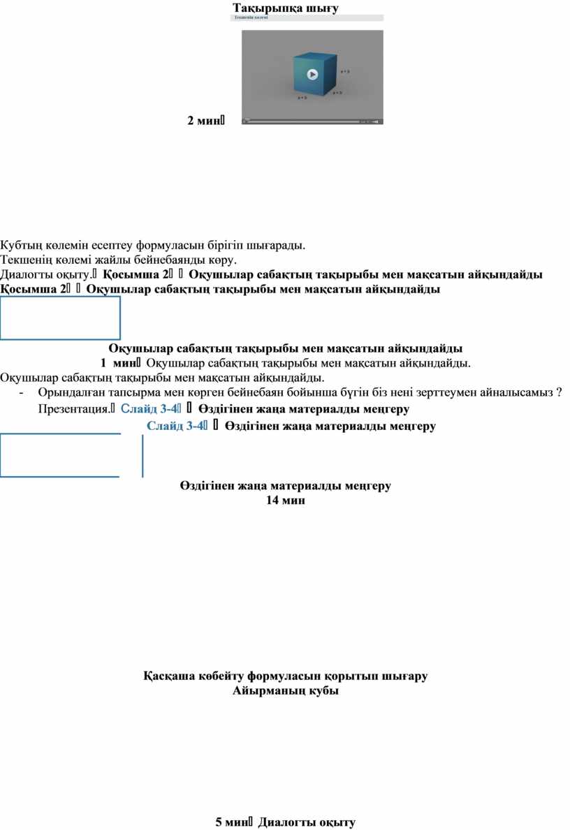 Кубтың көлемін есептеу формуласын бірігіп шығарады. Текшенің көлемі жайлы бейнебаянды көру. Диалогты оқыту. |