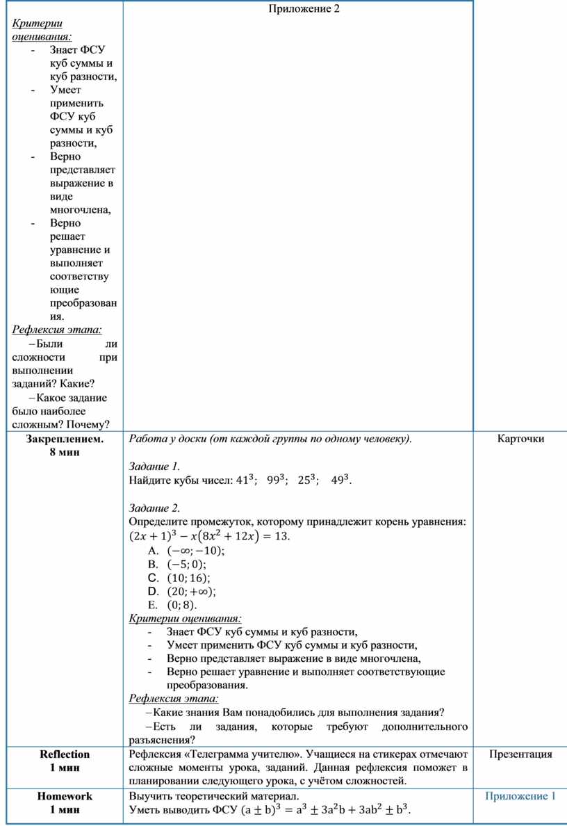 E. Критерии оценивания: - Знает ФСУ куб суммы и куб разности, - Умеет применить ФСУ куб суммы и куб разности, - Верно представляет выражение в виде многочлена, - Верно решает уравнение и выполняет соответствующие преобразования. Рефлексия этапа: - Какие знания Вам понадобились для выполнения задания? - Есть ли задания, которые требуют дополнительного разъяснения? |