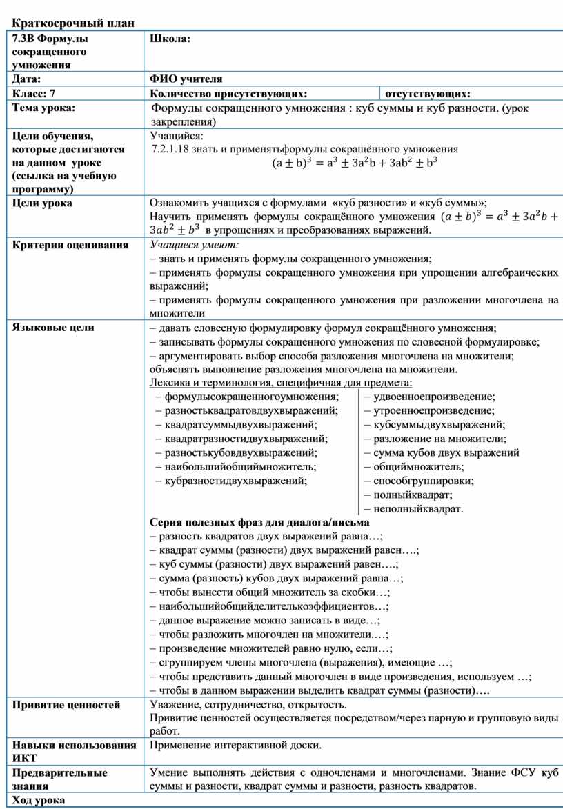 - давать словесную формулировку формул сокращённого умножения; - записывать формулы сокращенного умножения по словесной формулировке; - аргументировать выбор способа разложения многочлена на множители; объяснять выполнение разложения многочлена на множители. Лексика и терминология, специфичная для предмета:
