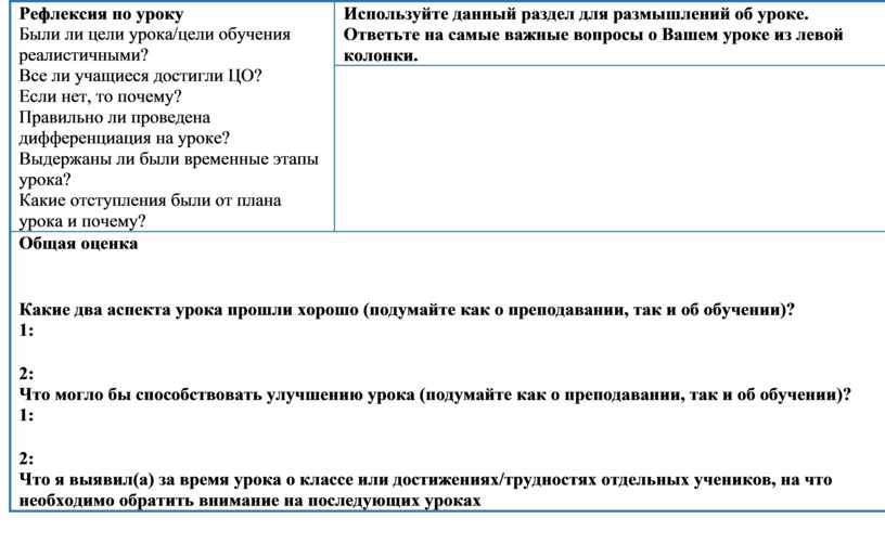 Используйте данный раздел для размышлений об уроке. Ответьте на самые важные вопросы о Вашем уроке из левой колонки. |