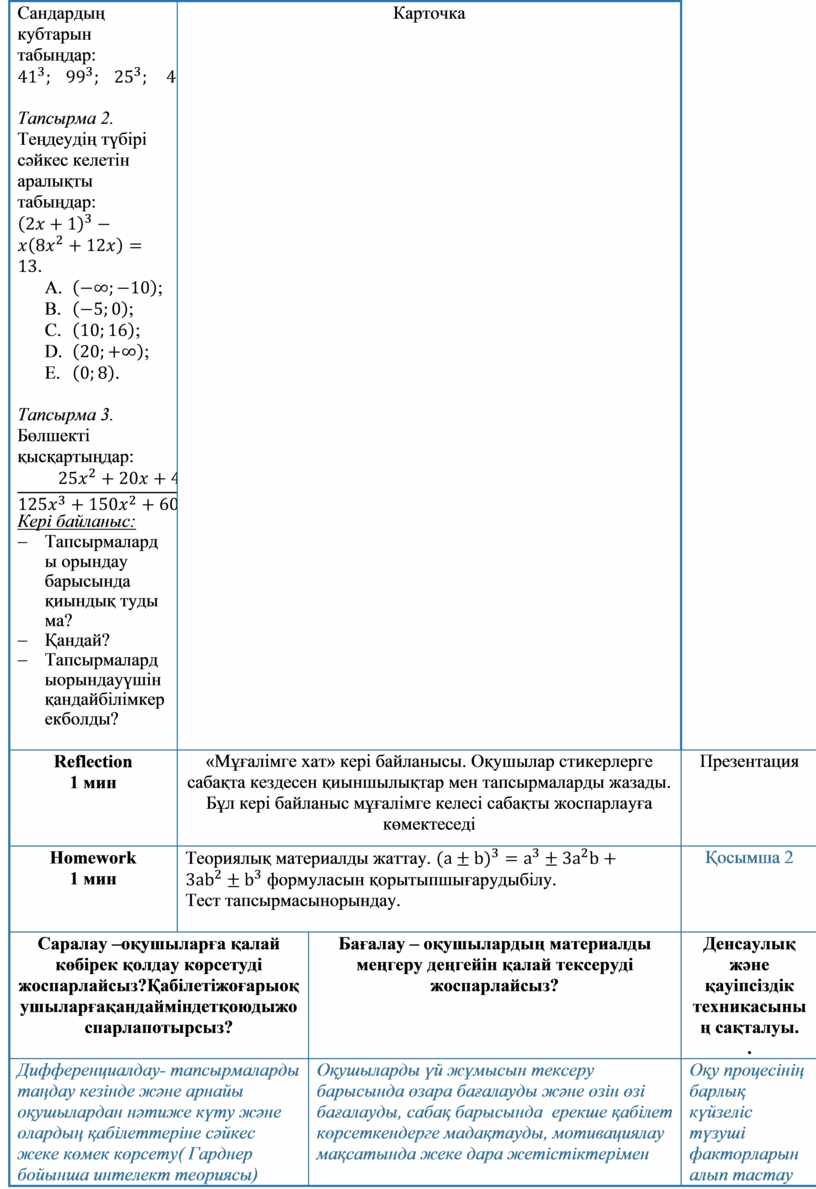 Кері байланыс: - Тапсырмаларды орындау барысында қиындық туды ма? - Қандай? - Тапсырмаларды орындау үшін қандай білім керек болды? |