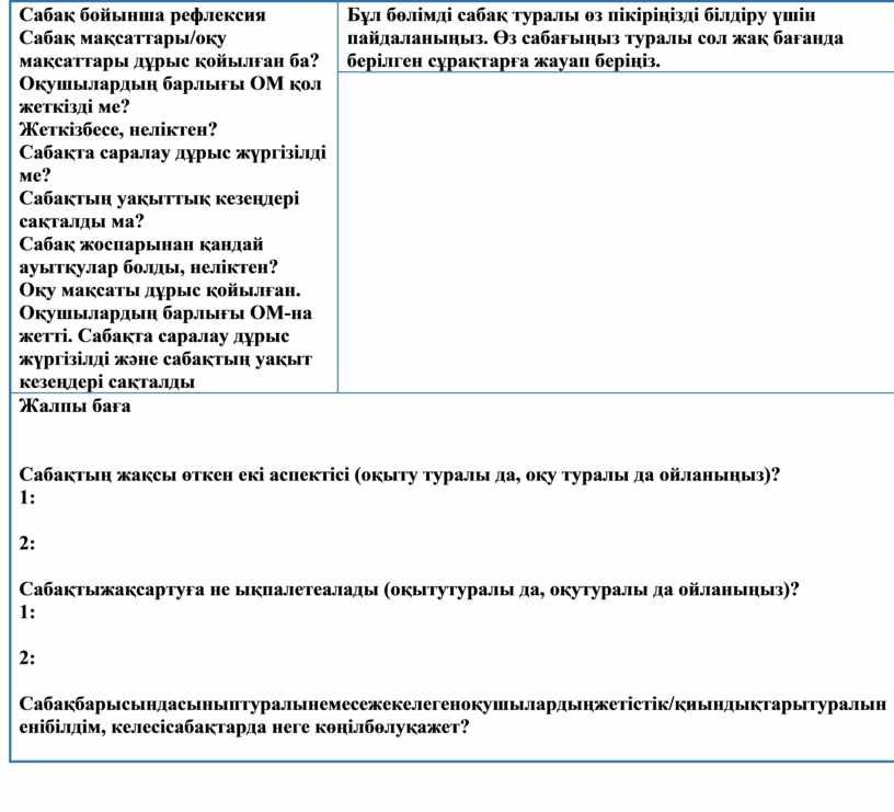 Бұл бөлімді сабақ туралы өз пікіріңізді білдіру үшін пайдаланыңыз. Өз сабағыңыз туралы сол жақ бағанда берілген сұрақтарға жауап беріңіз. |