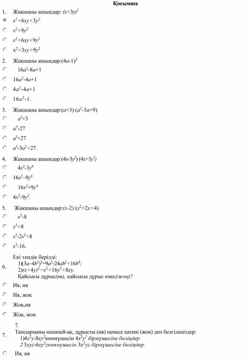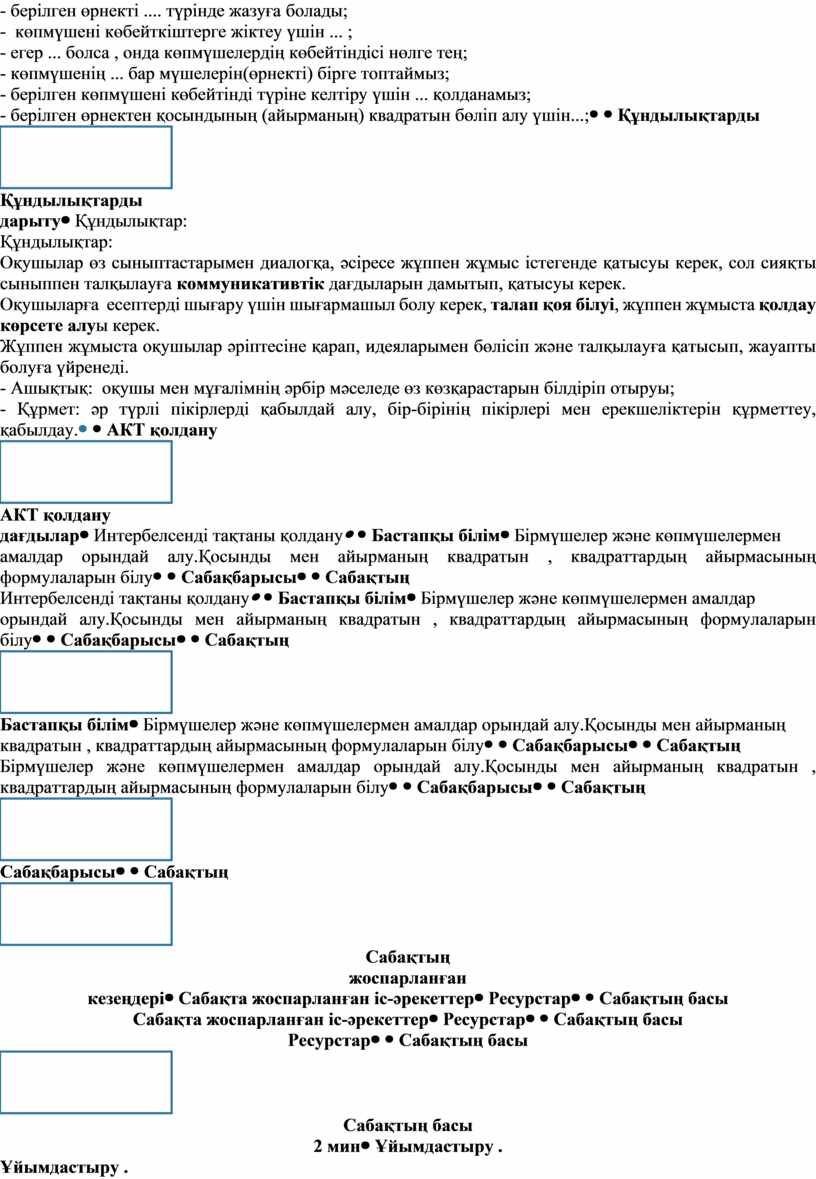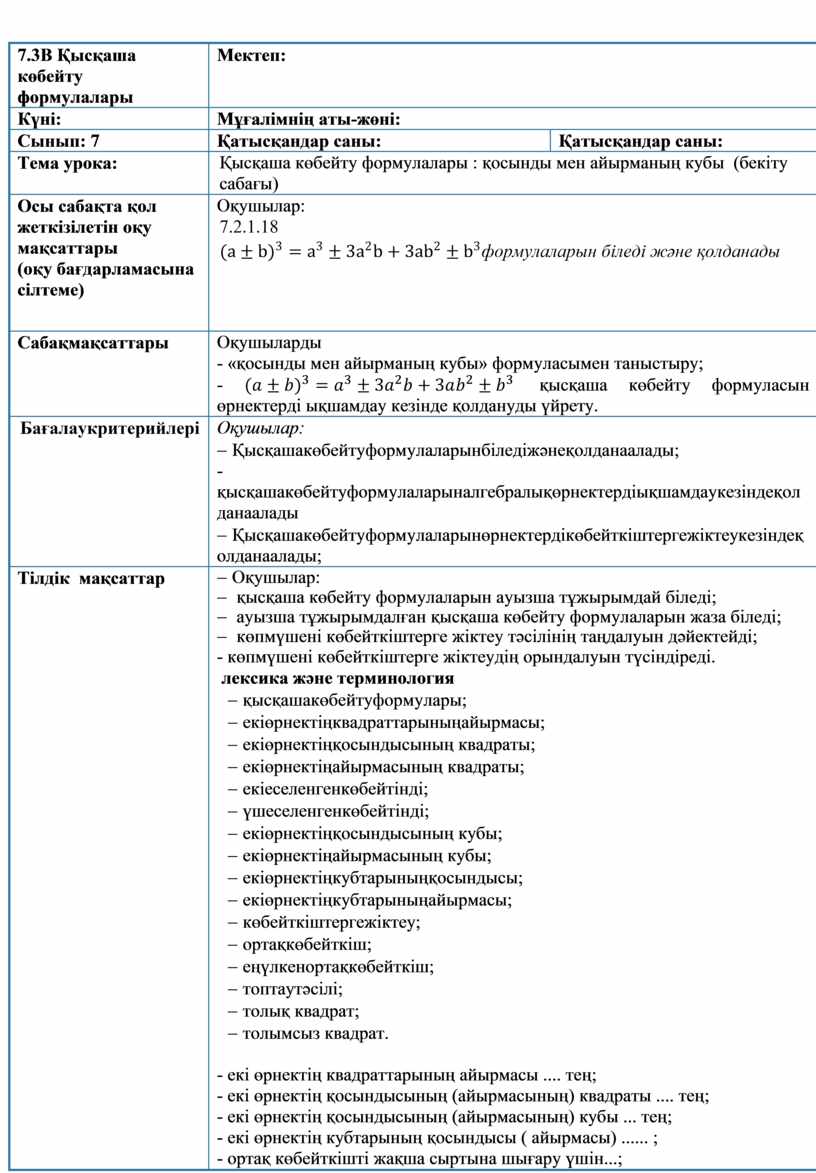 - Оқушылар: - қысқаша көбейту формулаларын ауызша тұжырымдай біледі; - ауызша тұжырымдалған қысқаша көбейту формулаларын жаза біледі; - көпмүшені көбейткіштерге жіктеу тәсілінің таңдалуын дәйектейді; - көпмүшені көбейткіштерге жіктеудің орындалуын түсіндіреді. лексика және терминология - қысқашакөбейтуформулары; - екіөрнектіңквадраттарыныңайырмасы; - екіөрнектіңқосындысының квадраты; - екіөрнектіңайырмасының квадраты; - екіеселенгенкөбейтінді; - үшеселенгенкөбейтінді; - екіөрнектіңқосындысының кубы; - екіөрнектіңайырмасының кубы; - екіөрнектіңкубтарыныңқосындысы; - екіөрнектіңкубтарыныңайырмасы; - көбейткіштергежіктеу; - ортақкөбейткіш; - еңүлкенортақкөбейткіш; - топтаутәсілі; - толық квадрат; - толымсыз квадрат.