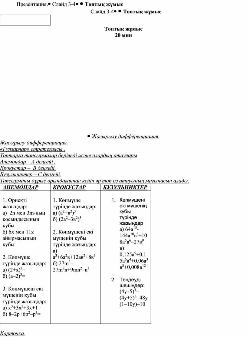 Жасырылу дифференциация. «Гүлзарлар» стратегиясы . Топтарға тапсырмалар беріледі және олардың атаулары Анемондар – А деңгейі , Крокустар – В деңгейі, Бузульниктер – С деңгейі. Тапсырманы дұрыс орындағаннан кейін әр топ өз атауының мағынасын алады.