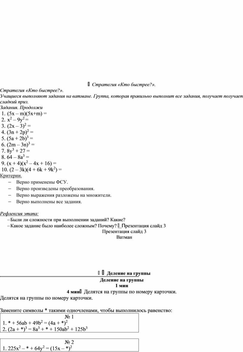 Стратегия «Кто быстрее?». Учащиеся выполняют задания на ватмане. Группа, которая правильно выполнит все задания, получает получает сладкий приз. Задания. Продолжи 1. (5x – m)(5x+m) = 2. x2 – 9y2 = 3. (2x – 3)2 = 4. (3n + 2p)2 = 5. (5a + 2b)3 = 6. (2m – 3n)3 = 7. 8y3 + 27 = 8. 64 – 8a3 = 9. (x + 4)(x2 – 4x + 16) = 10. (2 – 3k)(4 + 6k + 9k2) = Критерии. - Верно применены ФСУ. - Верно произведены преобразования. - Верно выражения разложены на множители. - Верно выполнены все задания.