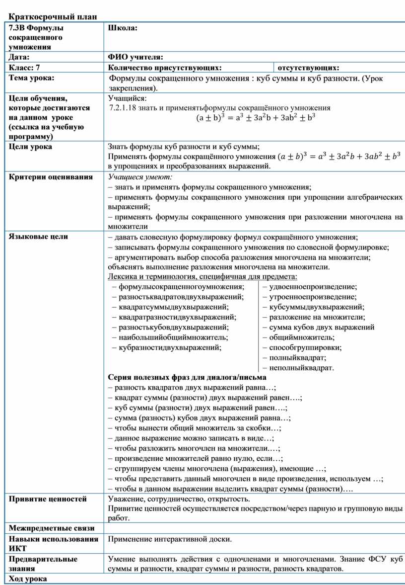 - давать словесную формулировку формул сокращённого умножения; - записывать формулы сокращенного умножения по словесной формулировке; - аргументировать выбор способа разложения многочлена на множители; объяснять выполнение разложения многочлена на множители. Лексика и терминология, специфичная для предмета: