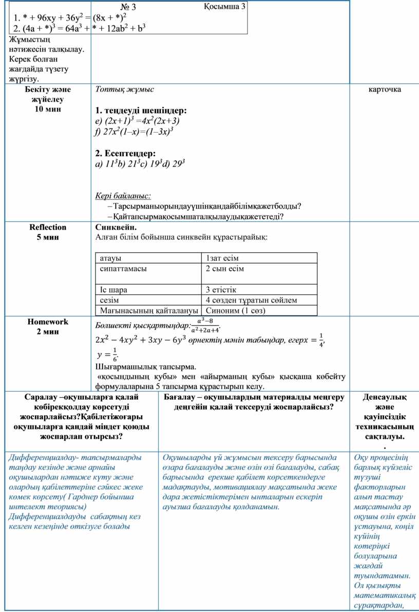 - Оқушылар: - қысқаша көбейту формулаларын ауызша тұжырымдай біледі; - ауызша тұжырымдалған қысқаша көбейту формулаларын жаза біледі; - көпмүшені көбейткіштерге жіктеу тәсілінің таңдалуын дәйектейді; - көпмүшені көбейткіштерге жіктеудің орындалуын түсіндіреді. Пәнге қатысты лексика мен терминология