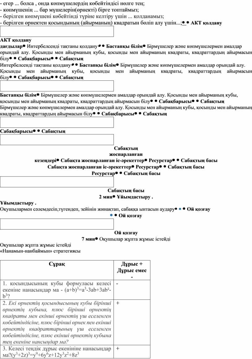 Бірмүшелер және көпмүшелермен амалдар орындай алу. Қосынды мен айырманың кубы, қосынды мен айырманың квадраты, квадраттардың айырмасын білу |