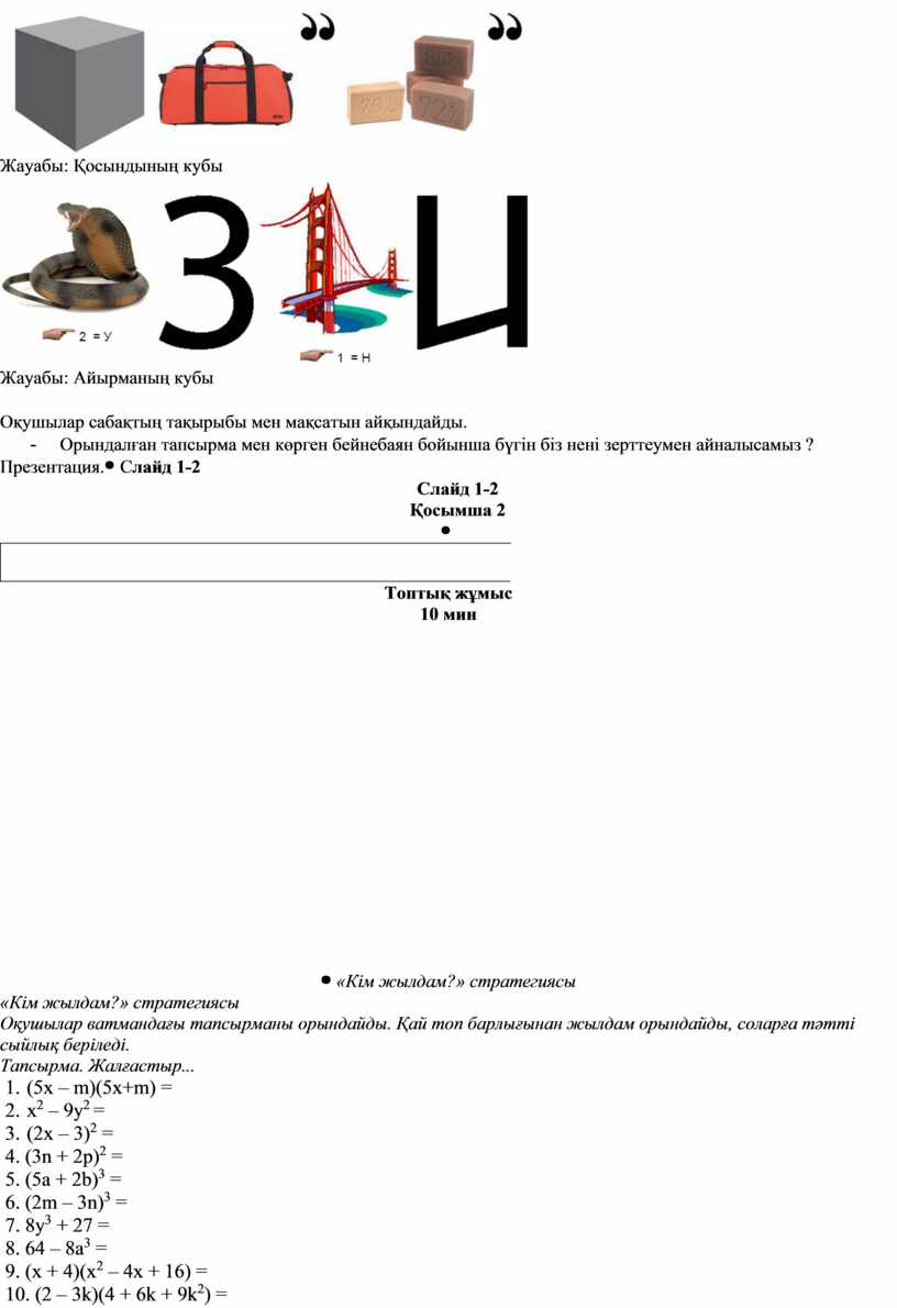 «Кім жылдам?» стратегиясы Оқушылар ватмандағы тапсырманы орындайды. Қай топ барлығынан жылдам орындайды, соларға тәтті сыйлық беріледі. Тапсырма. Жалғастыр... 1. (5x – m)(5x+m) = 2. x2 – 9y2 = 3. (2x – 3)2 = 4. (3n + 2p)2 = 5. (5a + 2b)3 = 6. (2m – 3n)3 = 7. 8y3 + 27 = 8. 64 – 8a3 = 9. (x + 4)(x2 – 4x + 16) = 10. (2 – 3k)(4 + 6k + 9k2) = Жетістіккритерийлер: - Қысқаша көбейту формулалары дұрыс қолданған - Түрлендірулер дұрыс жүргізілген - Өрнекті көбейткіштерге жіктеу дұрыс орындалған - Барлық тапсырмалар дұрыс орындалған