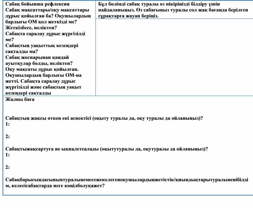 Бұл бөлімді сабақ туралы өз пікіріңізді білдіру үшін пайдаланыңыз. Өз сабағыңыз туралы сол жақ бағанда берілген сұрақтарға жауап беріңіз. |