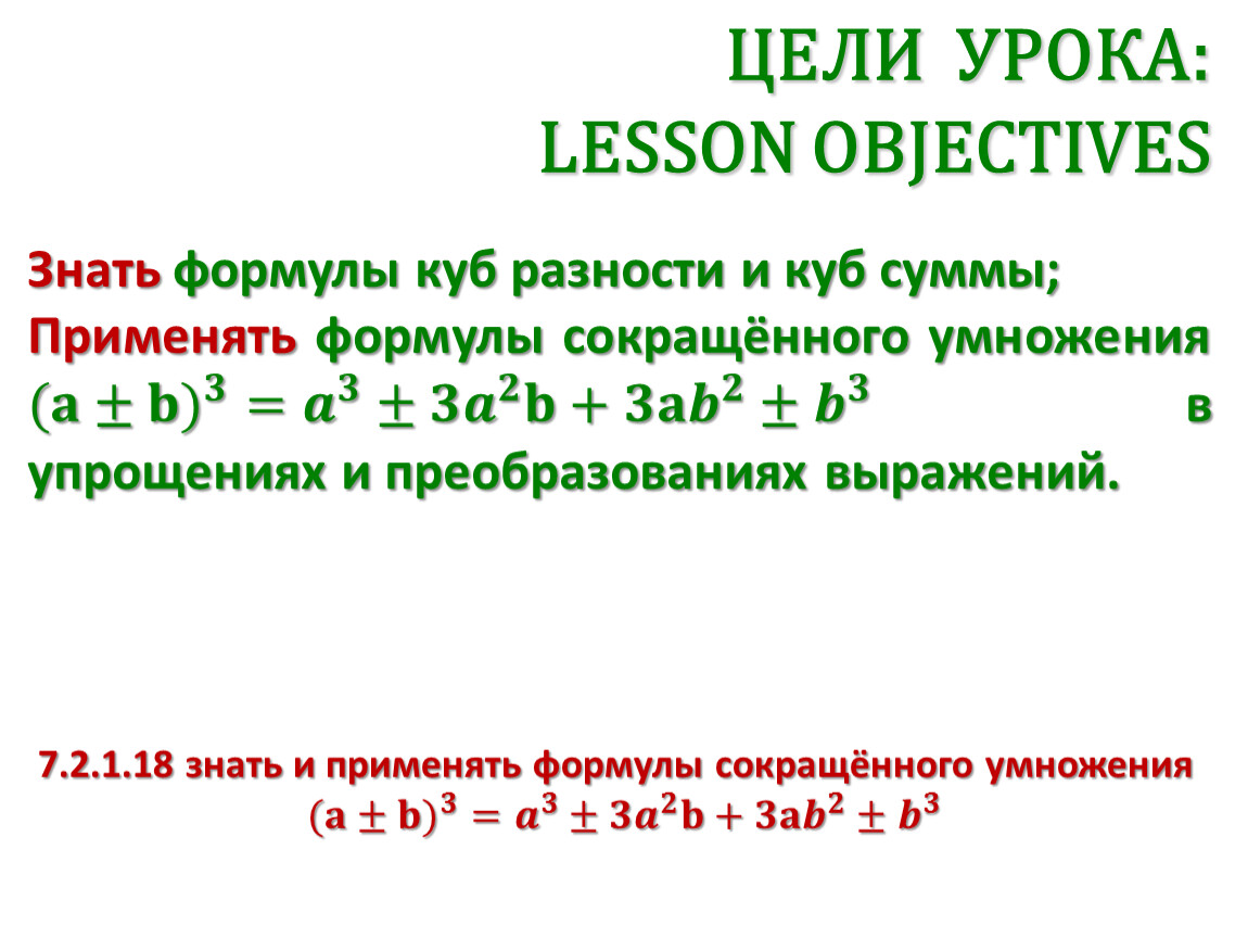 Применять формулы сокращённого умножения (𝐚𝐚± 𝐛) 𝟑 𝐛𝐛) 𝐛) 𝟑 𝟑𝟑 𝐛) 𝟑 = 𝒂 𝟑 𝒂𝒂 𝒂 𝟑 𝟑𝟑 𝒂 𝟑 ±𝟑𝟑 𝒂 𝟐 𝒂𝒂 𝒂 𝟐 𝟐𝟐 𝒂 𝟐 𝐛𝐛+𝟑𝟑𝐚𝐚 𝒃 𝟐 𝒃𝒃 𝒃 𝟐 𝟐𝟐 𝒃 𝟐 ± 𝒃 𝟑 𝒃𝒃 𝒃 𝟑 𝟑𝟑 𝒃 𝟑 в упрощениях и преобразованиях выражений.
