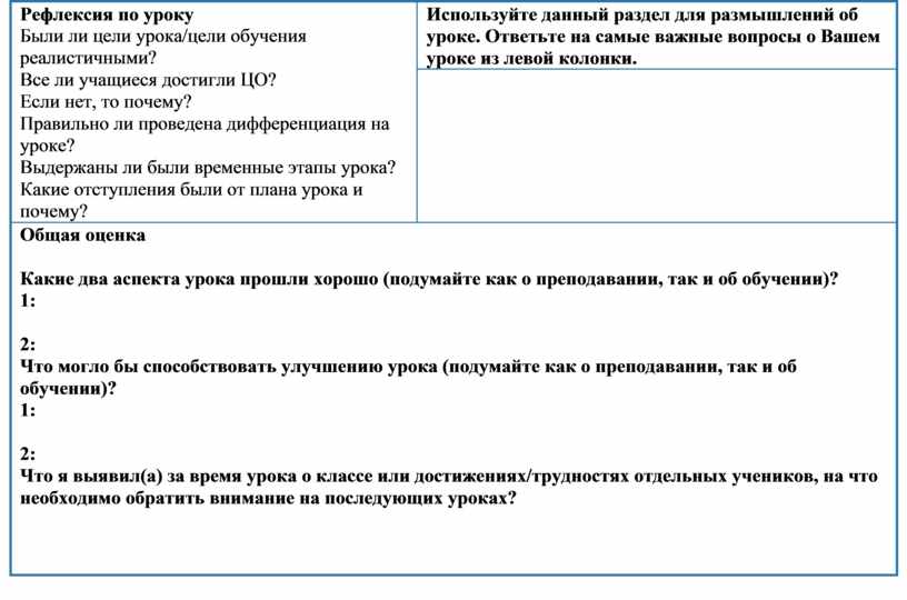 Используйте данный раздел для размышлений об уроке. Ответьте на самые важные вопросы о Вашем уроке из левой колонки. |