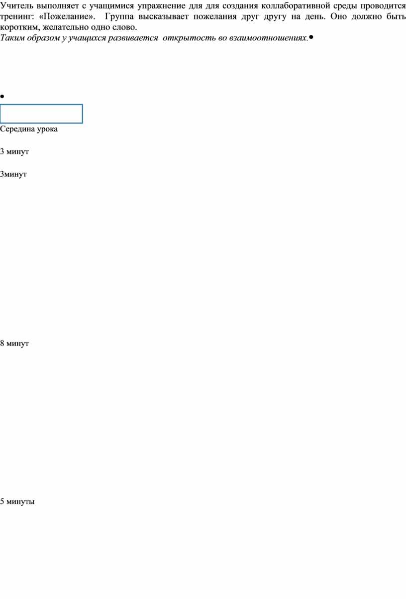 В начале урока учитель и учащиеся приветствуют друг друга. Учитель выполняет с учащимися упражнение для для создания коллаборативной среды проводится тренинг: «Пожелание». Группа высказывает пожелания друг другу на день. Оно должно быть коротким, желательно одно слово. Таким образом у учащихся развивается открытость во взаимоотношениях. |
