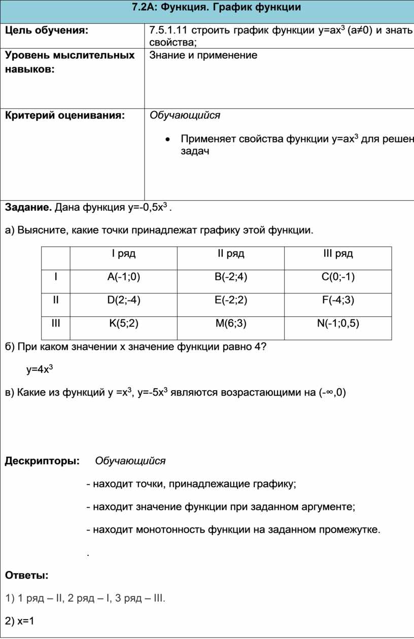 Дескрипторы: Обучающийся - находит точки, принадлежащие графику; - находит значение функции при заданном аргументе; - находит монотонность функции на заданном промежутке. . Ответы: 1) 1 ряд – ІІ, 2 ряд – І, 3 ряд – ІІІ. 2) х=1 3) у =х3 |