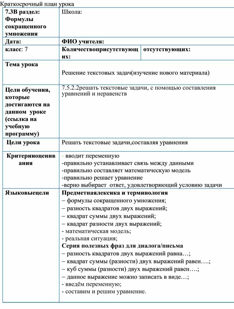 Предметнаялексика и терминология - формулы сокращенного умножения; - разность квадратов двух выражений; - квадрат суммы двух выражений; - квадрат разности двух выражений; - математическая модель; - реальная ситуация; Серия полезных фраз для диалога/письма - разность квадратов двух выражений равна…; - квадрат суммы (разности) двух выражений равен….; - куб суммы (разности) двух выражений равен….; - данное выражение можно записать в виде…; - введём переменную; - составим и решим уравнение.